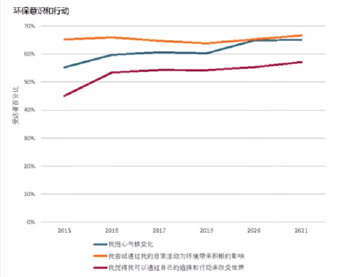根據(jù)報告顯示,2021年,約65%的全球消費(fèi)者擔(dān)心“氣候變化”問題,消費(fèi)者逐漸意識到個人行動對于氣候變化的影響,以及氣候變化對日常生活的影響,生態(tài)焦慮促使消費(fèi)者們開始更加關(guān)注環(huán)保行動和購買決策。