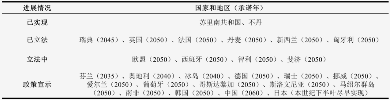 目前有兩個國家(蘇里南共和國與不丹)已經(jīng)實(shí)現(xiàn)了碳中和;瑞典等六個國家已將實(shí)現(xiàn)碳中和的時(shí)間寫入法律;還有部分國家正對碳中和進(jìn)行立法;包括中國在內(nèi)的多個國家已經(jīng)宣示了相關(guān)政策。具體情況如下圖所示: