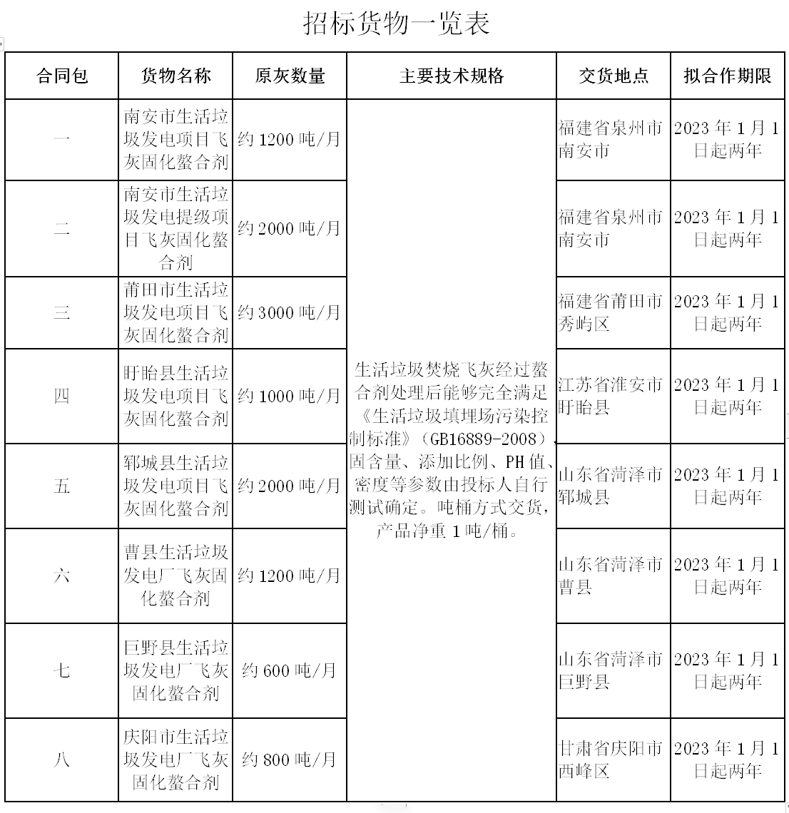 圣元環(huán)保股份有限公司對(duì)南安市生活垃圾焚燒發(fā)電廠、南安市生活垃圾焚燒發(fā)電廠提級(jí)項(xiàng)目、莆田市生活垃圾焚燒發(fā)電廠、盱眙縣生活垃圾焚燒發(fā)電廠、鄆城縣生活垃圾焚燒發(fā)電廠、曹縣生活垃圾焚燒發(fā)電廠、巨野縣生活垃圾焚燒發(fā)電廠、慶陽(yáng)市生活垃圾焚燒發(fā)電廠飛灰固化螯合劑采購(gòu)項(xiàng)目的下述貨物及服務(wù)進(jìn)行國(guó)內(nèi)公開(kāi)招標(biāo),現(xiàn)歡迎國(guó)內(nèi)合格的投標(biāo)人前來(lái)提交密封的投標(biāo)。