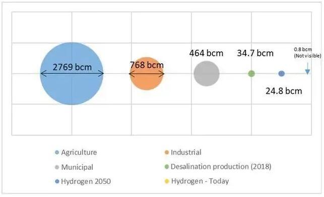 即使電解氫能滿足整個(gè)2050年的氫需求,用水量也將約為250億立方米。下圖將這個(gè)數(shù)字與其他人為的水消耗流進(jìn)行了對比。農(nóng)業(yè)用水是2800億立方米中最大的,工業(yè)用水接近8000億立方米,城市用水4700億立方米。目前天然氣重整和煤氣化制氫的用水量約為15億立方米。