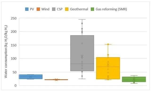 另一個(gè)組成部分是生產(chǎn)可再生電力和天然氣的水消耗。光伏發(fā)電的用水量在50-400升/MWh(2.4-19kgH2O/kgH2)之間變化,風(fēng)力發(fā)電的用水量在5-45升/MWh(0.2-2.1kgH2O/kgH2)之間。同樣,頁巖氣(根據(jù)美國數(shù)據(jù))的天然氣產(chǎn)量可以從1.14kgH2O/kgH2提高到4.9kgH2O/kgH2。