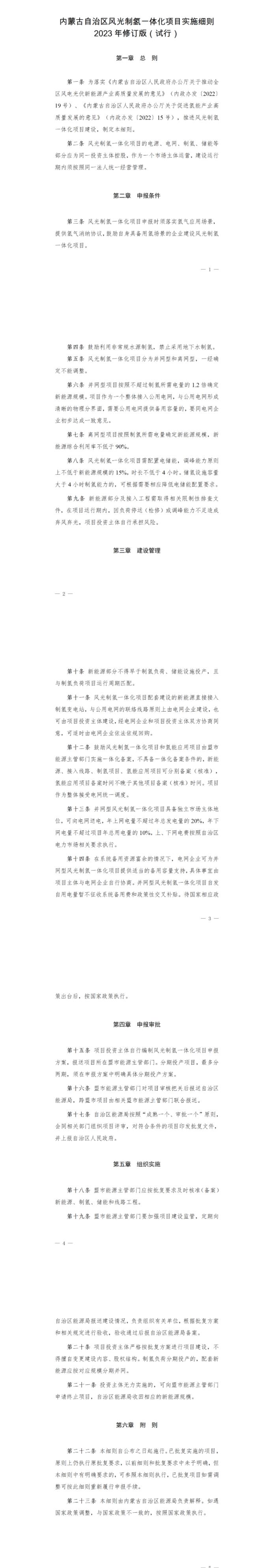 近日,內(nèi)蒙古自治區(qū)能源局發(fā)布《內(nèi)蒙古自治區(qū)風(fēng)光制氫一體化項目實施細則2023年修訂版(試行)》等六個市場化實施細則的通知。其中指出:鼓勵利用非常規(guī)水源制氫,禁止采用地下水制氫。風(fēng)光制氫一體化項目分為并網(wǎng)型和離網(wǎng)型,一經(jīng)確定不能調(diào)整。并網(wǎng)型項目按照不超過制氫所需電量的1.2倍確定新能源規(guī)模。并網(wǎng)型項目按照不超過制氫所需電量的1.2倍確定新能源規(guī)模。風(fēng)光制氫一體化項目需配置電儲能,調(diào)峰能力原則上不低于新能源規(guī)模的15%,時長不低于4小時。儲氫設(shè)施容量大于4小時制氫能力的,可根據(jù)需要相應(yīng)降低電儲能配置要求。