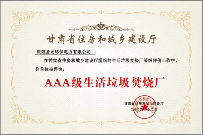 近日,慶陽圣元順利通過甘肅省住房和城鄉(xiāng)建設(shè)廳組織的全省生活垃圾焚燒廠等級評價(jià),獲評甘肅省AAA級生活垃圾焚燒廠。
