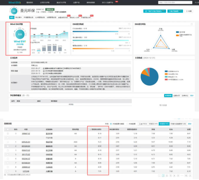 近日,國內(nèi)權(quán)威的金融數(shù)據(jù)服務(wù)提供商萬得(Wind)發(fā)布公司最新的ESG評分評級結(jié)果。圣元環(huán)保(300867.SZ)憑借在環(huán)境、社會和公司治理(ESG)領(lǐng)域的卓越表現(xiàn)和管理成果獲評“AA”級,在Wind ESG綜合得分中獲評8.18分,在環(huán)保行業(yè)141家公司中位列第3名。