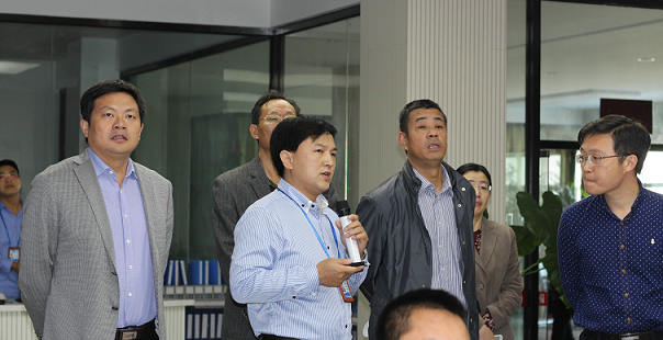 圖為總經(jīng)理李英杰向調(diào)研組詳細(xì)介紹了公司運(yùn)營概況。左三:華東督查主任高峰;左一:盱眙縣副縣長顧強(qiáng)